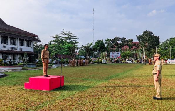 Sungailiat - Kepala Dinas Pangan dan Pertanian Kabupaten Bangka Syarli Nopriansyah, S.STP menjadi pembina pada kegiatan rutin apel mingguan, Senin (26/06/2023) bersama seluruh pegawai Pemerintah Kabupaten Bangka di halaman kantor Bupati Bangka.